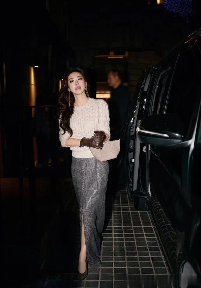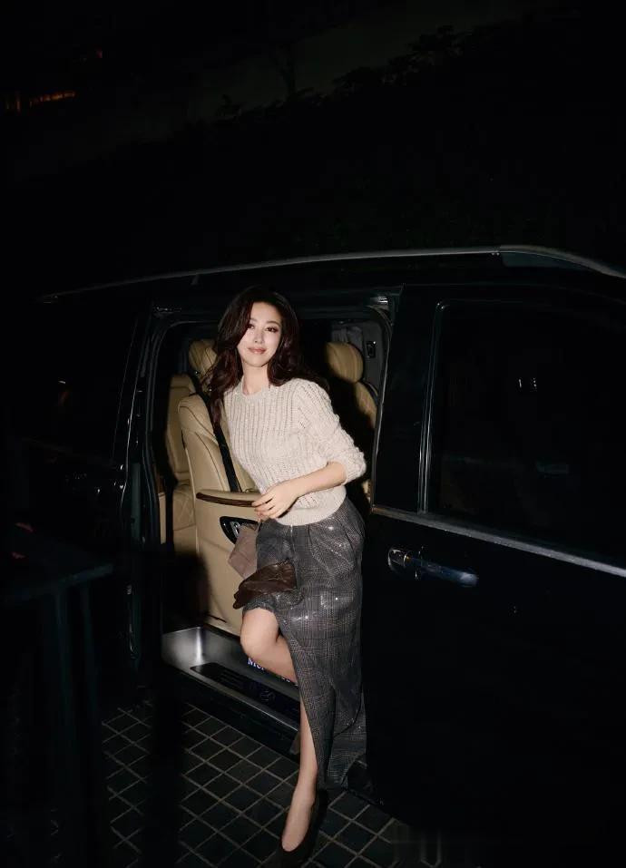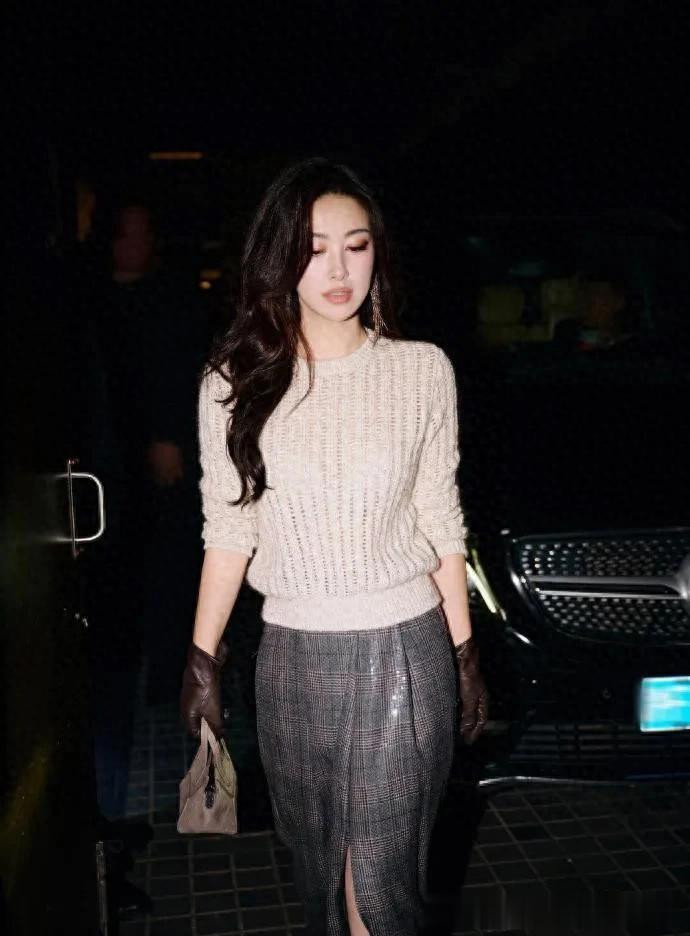 > 朱珠的气质真是出挑! 穿米色毛衣+格纹开叉裙, 简约温柔又高级